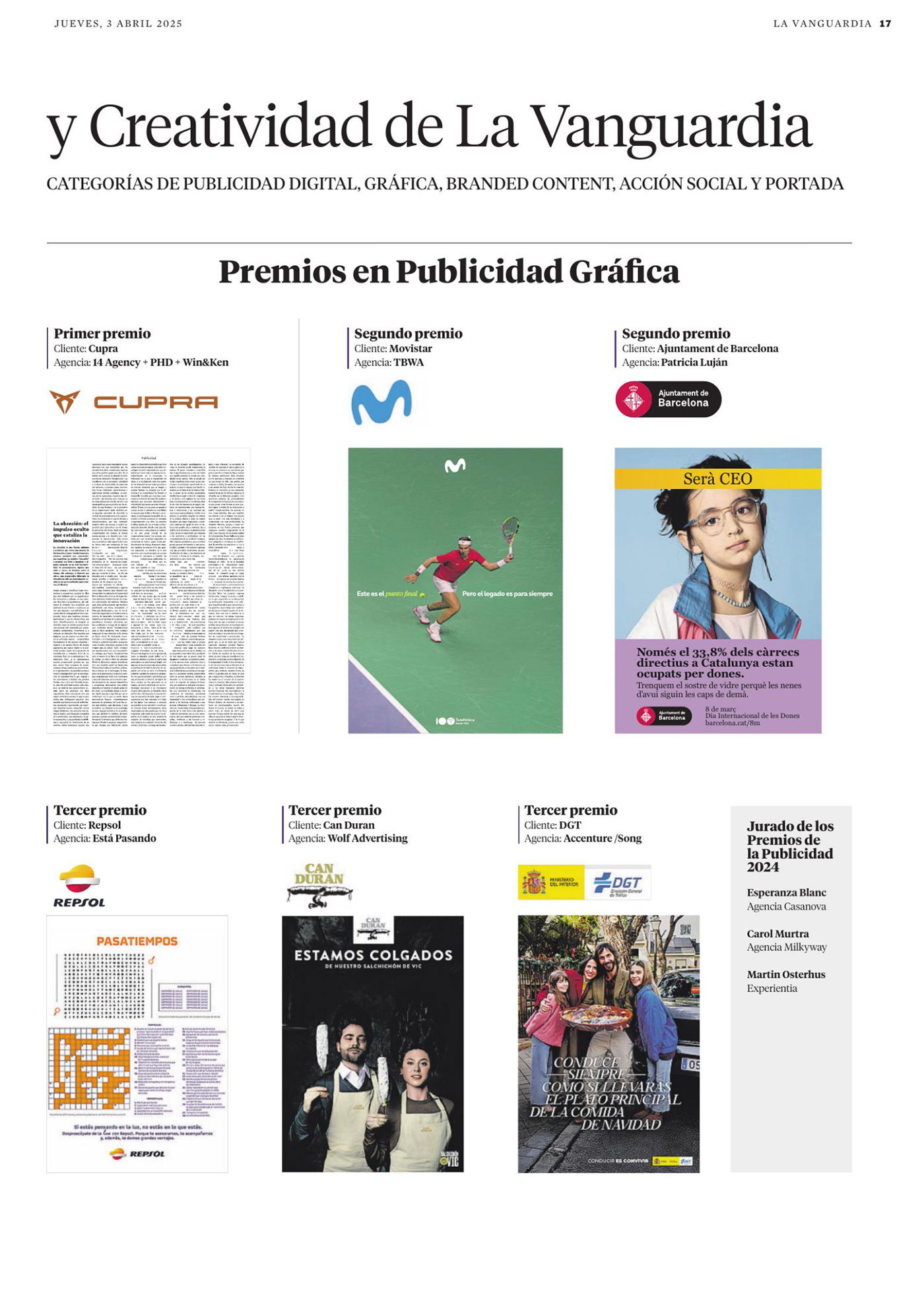 Estamos muy contentos de anunciar que hemos sido reconocidos con un premio en la categoría de publicidad gráfica por La Vanguardia. Este premio refleja nuestro compromiso con la creatividad, la innovación y el impacto visual en nuestras campañas publicitarias. Queremos agradecer a todo el equipo que ha hecho posible este reconocimiento y a La Vanguardia por esta distinción.